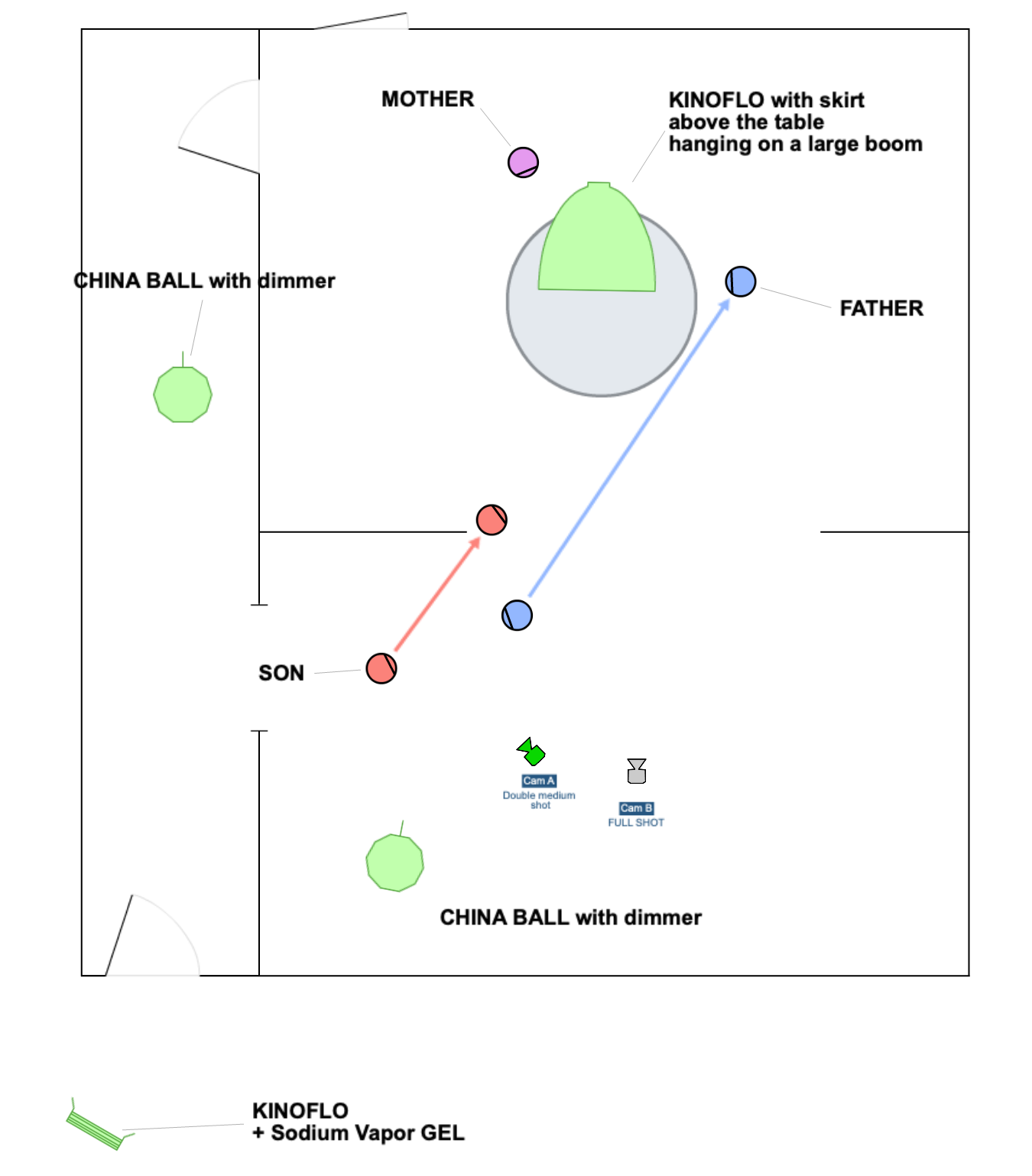 Στο σπίτι του Χρήστου, η προσέγγιση που ακολουθήσαμε ήταν να δείξουμε ένα όσο το δυνατόν πιο σκοτεινό και απεριποίητο σπίτι με θερμούς τόνους στα κοινόχρηστα δωμάτια (σαλόνι-τραπεζαρία-χωλ) και να διαφοροποιηθούμε μόνο στο δωμάτιο του Χρήστου. Στη νυχτερινή συνθήκη όπου επιστρέφει αργοπορημένα για να συναντήσει τον πατέρα του μόλις αποφυλακίσθηκε, ο φωτισμός είναι ένα κλασικό "καπέλo" .
